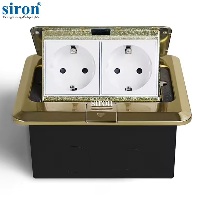 Ổ cắm âm sàn 145 gồm 2 ổ cắm chuẩn F Schuko màu vàng Siron Sr-PG2687 là sản phẩm thuộc dòng FS series của hãng sản xuất thiết bị điện Siron Việt Nam. Ổ cắm có vỏ ngoài được làm từ hợp kim chất lượng cao và bên trong làm bằng nhựa nguyên sinh an toàn, thân thiện với môi trường. Sản phẩm có nắp đóng tiện lợi và chắc chắn để ngăn nước và bụi không thể thâm nhập vào phần ổ cắm bên trong. Đặc biệt, nắp được thiết kế dạng bật, chỉ cần một tác động nhẹ là bộ phận ổ cắm bên trong tự động ẩn vào bên trong, vừa đảm bảo an toàn, vừa có tính thẩm mỹ cao. Sản phẩm có dạng ổ cắm đôi dùng để cắm phích cắm chuẩn F Schuko, phù hợp với loại phích cắm nhu cầu sử dụng cho văn phòng, đem đến sự tiện lợi cho người dùng.
